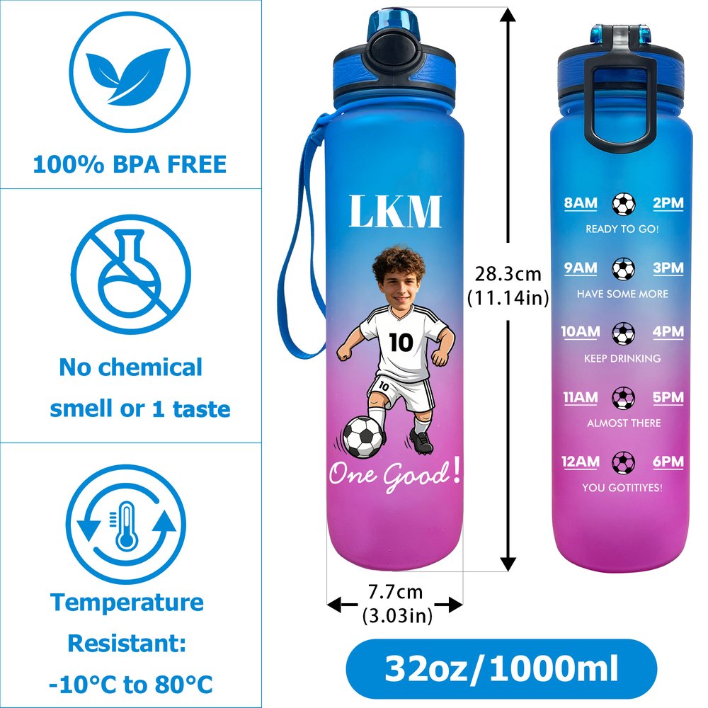 Personalised Cartoon Soccer Character Face Photo 32 oz Water Bottle with Name and Number Birthday Gift for Soccer Fans Lovers
