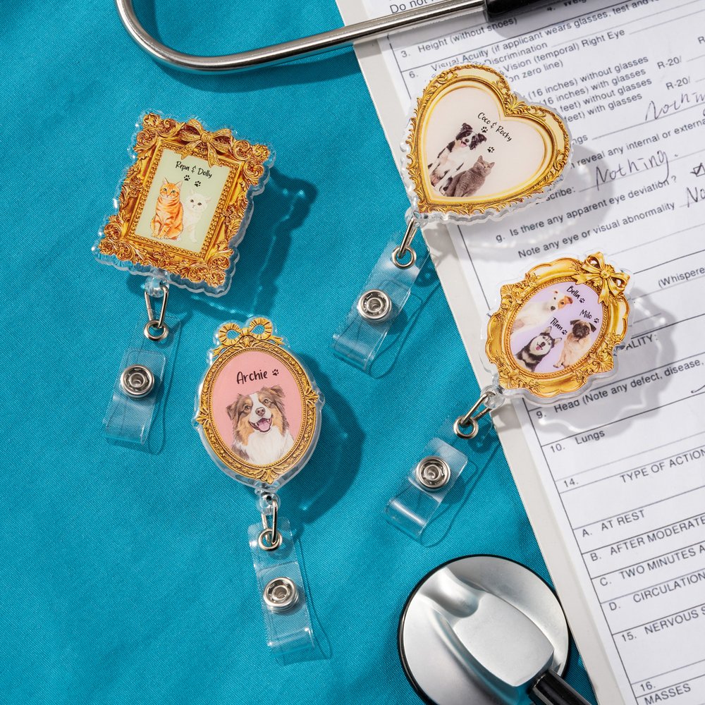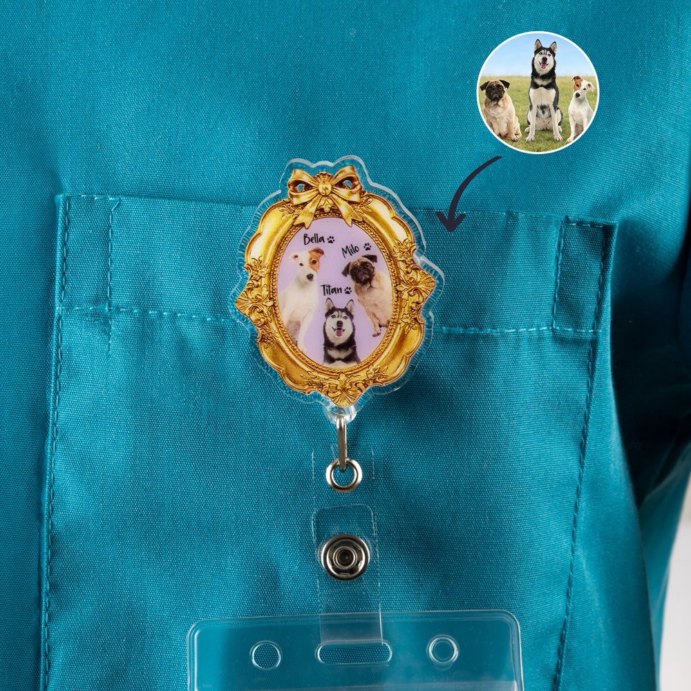 The badge reel features a whimsical, elegant aesthetic with ornate vintage-inspired frames in gold-toned detailing, framing custom pet portraits in soft, vibrant colors. Add custom names and photos for each pet, creating a one-of-a-kind design that reflects your furry family.