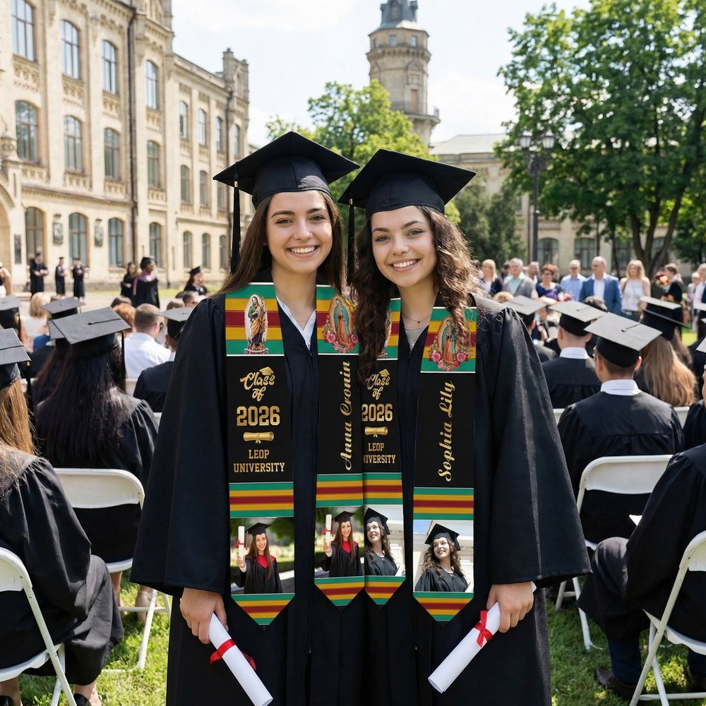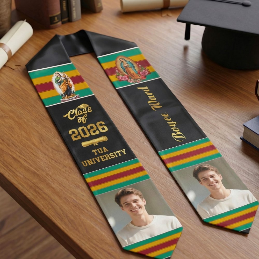 Inspired by graduation season, this sash incorporates classic motifs of St. Jude and Our Lady of Guadalupe. The front can be customized with a graduation photo, name, school, and year, creating a unique graduation commemorative sash.